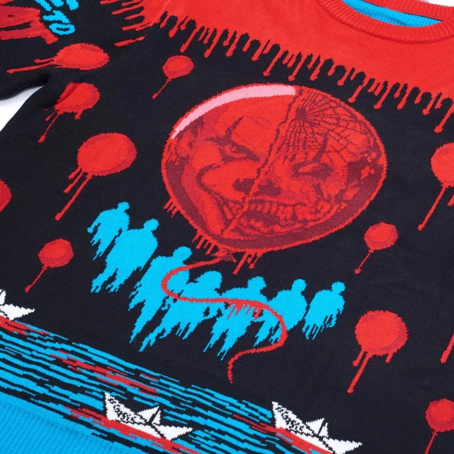 If youβve ever seen the iconic movie, IT, the sight of a lone red balloon is sure to give you the creeps! This spooktastic jumper features an array of red balloons floating into the distance with Pennywise silently searching for his next victim. Take your Halloween party to the next level with this spine-chilling high-quality jumper!