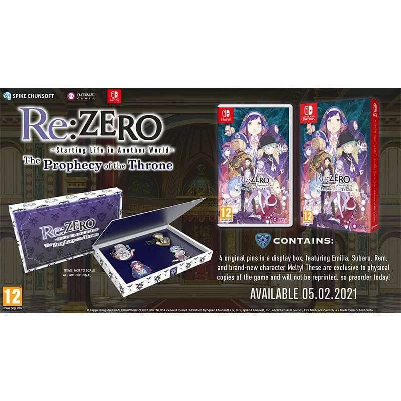 Re:ZERO – The Prophecy of the Throne includes 4 exclusive, limited run only original pins in a display box, featuring Emilia, Subaru, Rem, and a brand-new character yet to be revealed! These are exclusive to physical copies of the game and will not be reprinted, so preorder today! One month after Subaru’s new life in another world began, an emissary sent by the royal castle suddenly appears with news that the royal selection has been postponed, but offers no reason as to why. The postponement of this grand event that decides the next ruler of the Kingdom of Lugunica stirs Subaru and his friends into action. They return to the royal capital only to find that a sixth candidate has claimed their stake for the throne. But the Dragon Stone prophesizes that only five candidates would be chosen. With one candidate being an imposter, suspicions are immediately cast toward one woman in particular: Emilia. What answers lie beyond the mysterious web of assassinations, betrayal, and conspiracies…?