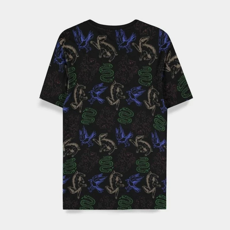 Splash some colour into your next outfit with this magical official Harry Potter t-shirt showcasing a trendy all-over-print design with each Hogwarts house emblem in their signature colour.