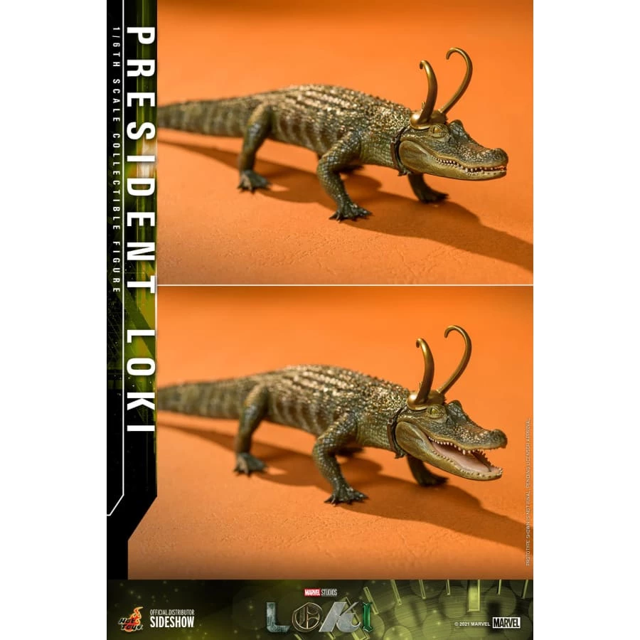 Exquisitely crafted based on the screen appearance of Tom Hiddleston as President Loki in the series, the figure features a newly developed head sculpt and his horned helmet with delicate craftsmanship, election campaign pin on the suit applied with weathering effects perfectly translating the details; a pair of daggers, greatly detailed accessories such as Alligator Loki in one-sixth scale, a cane, a specially designed character backdrop with lenticular effect, and a themed figure stand.