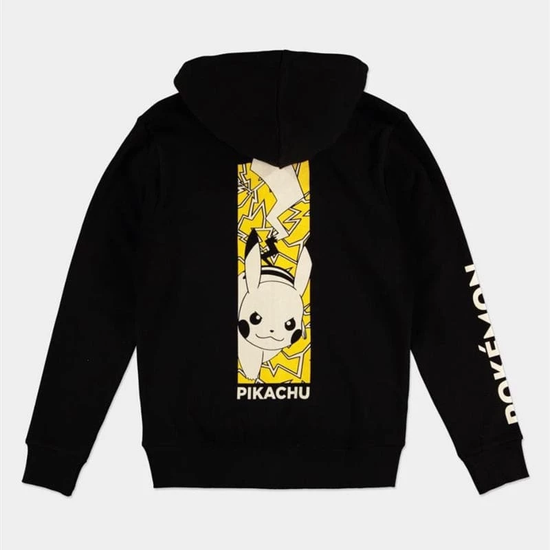 Our all-time favorite character is back! This black cotton blend hoodie features a kangaroo pocket, screen-printed graphics of Pikachu at sleeve and back and embroidery at chest.