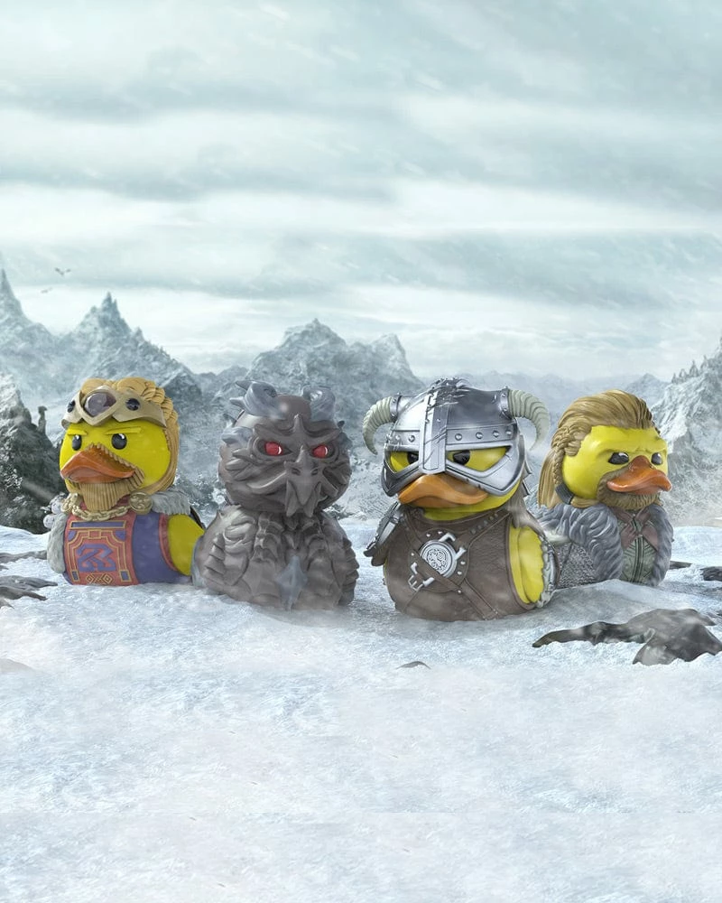 Traverse the world and explore the mountains, fields, and villages of Skyrim with the Elder Scrolls range of TUBBZ, the collectible cosplaying duck figurines! The powerful dragon Alduin joins his Skyrim cohorts in this premium collectorβs range. Coming boxed in an awesome displayable βSkyrimβ tub display stand, this one of a kind collectible is great for fans of the series to stock up on!